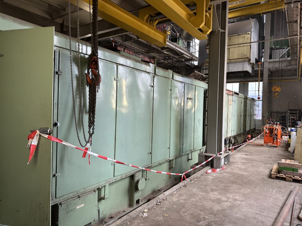 Met gebruik van diverse hef, slede-, en hijsmiddelen zijn de componenten op transportstellen gezet en richting de uitgang van het gebouw gebracht. Met behulp van een hijskraan zijn de componenten verder naar buiten gehaald, op een dieplader geladen en getransporteerd naar een geschikte werkplaats om daar geheel te worden overhaalt. Alle onderdelen zijn daar gereinigd en waar nodig vervangen of gerepareerd.